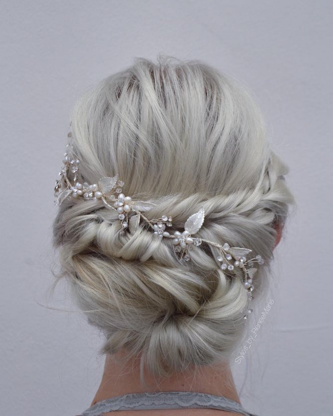Собранные причёски часто выглядят чересчур просто. Но используя правильный аксессуар, можно любую скромную свадебную причёску превратить в нечто потрясающее. Изящная повязка для волос, украшенная жемчугом и стразами, отлично смотрится в качестве свадебного аксессуара, а причёска выглядит элегантно и изысканно. Более того, она очень проста в исполнении и не требует профессиональных парикмахерских навыков.