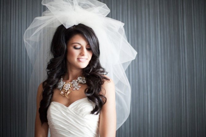 Этот аксессуар также имеет необычный способ крепления. Ткань собирается в множество складок на заколке и окутывает невесту пышным облаком.