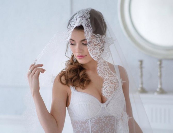 Этот испанский аксессуар имеет интересный способ крепления. Эта модель выглядит как кружевной платок покрывающий голову и плечи невесты, а крепится он невидимками, за счет чего создается впечатление, что крепления и вовсе отсутствуют.