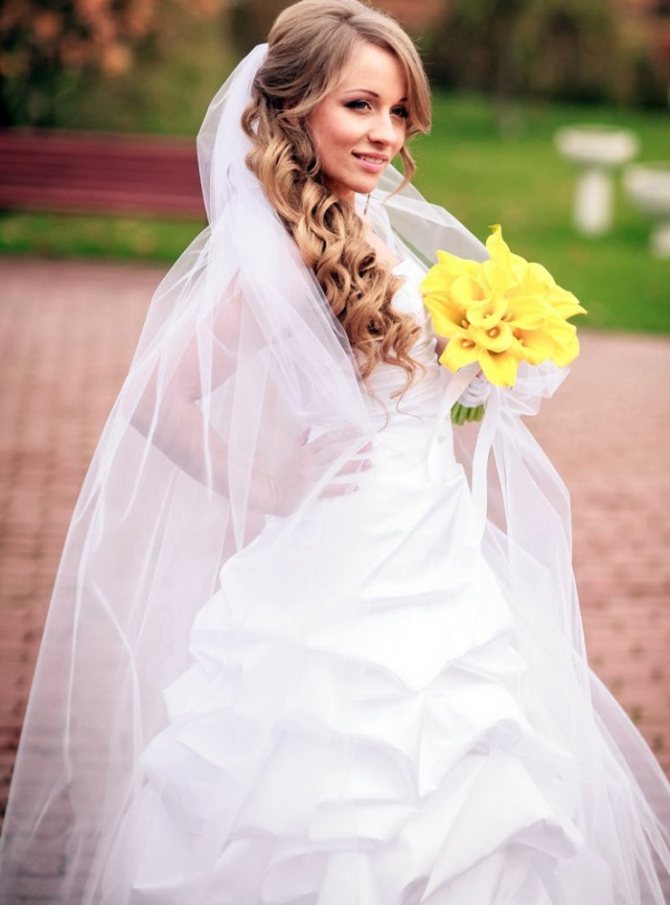 Такая модель добавляет в образ невесты некую загадочность, а также сдержанность. Сложные пышные прически будут смотреться нелепо с такой фатой, более уместно будет сделать простую и гладкую укладку.