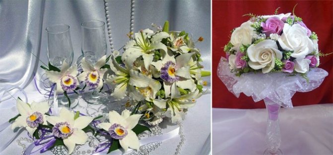 Поскольку из полимерной глины можно слепить все, что придет в голову, такой букет подойдет под любой стиль свадьбы. Для классического торжества композиция составляется из стандартных растений – роз, лилий, орхидей или калл, все они могут быть вылеплены из податливого материала. При этом можно придать композиции любую форму, но гармоничней всего будет выглядеть полусферическая. Полевые цветы, сделанные из полимерной глины, подойдут для торжества в стиле бохо, рустик или кантри.