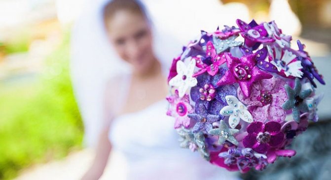 А как же традиционная ловля букета невесты? Предусмотрительные невесты об этом обряде заботятся заранее, приобретая букетик попроще, но из живых растений. Зато на фотографии в руках невесты красуется чудо-букет.