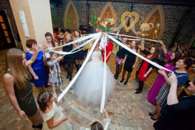 Ритуал с букетом можно превратить в конкурс с жребием. Для этого надо приготовить красивые ленточки, ровно столько, сколько желающих, участвовать в конкурсе невест. Эти ленточки надо в несколько оборотов обмотать вокруг основания цветочной композиции, но лишь одну привязать крепким узлом. Концы ленточки должны свисать в свободном доступе, поэтому заранее позаботьтесь, чтобы они были длинными. Когда начнется задуманное мероприятие, каждая незамужняя девушка должна выбрать свой кончик ленточки, той, которая достанется ленточка, удерживающая букет, и есть счастливая избранница.
