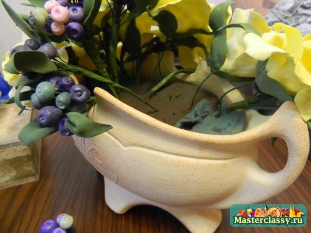 Теперь помещаем в кашпо или другую емкость основу из пенопласта. И начинаем, втыкая заготовки цветов и ягод в нее, формировать букет.