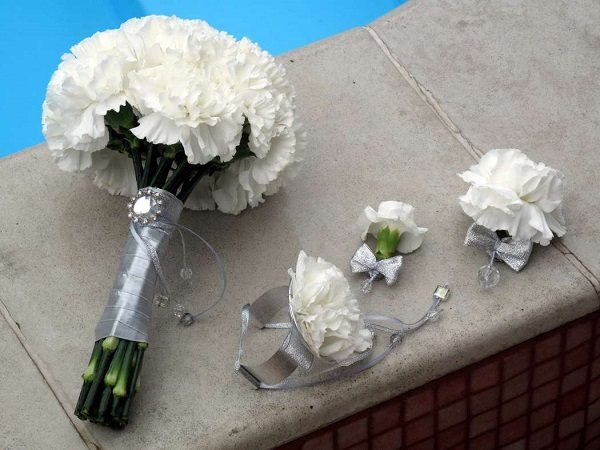 Букет из белых гвоздик можно украсить серебристой атласной лентой
