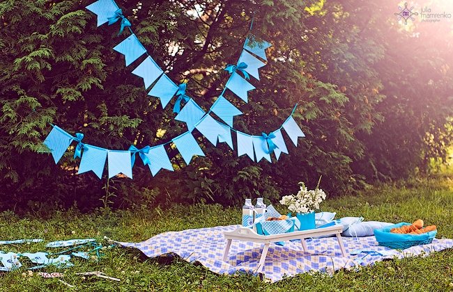 - Прогулка по лесу или пикник на лужайке. В качестве реквизитов можно использовать яркий плед, корзинку с фруктами, венок из луговых цветов. Отличные фотографии получаются во время прогулки с собакой или велопрогулки.