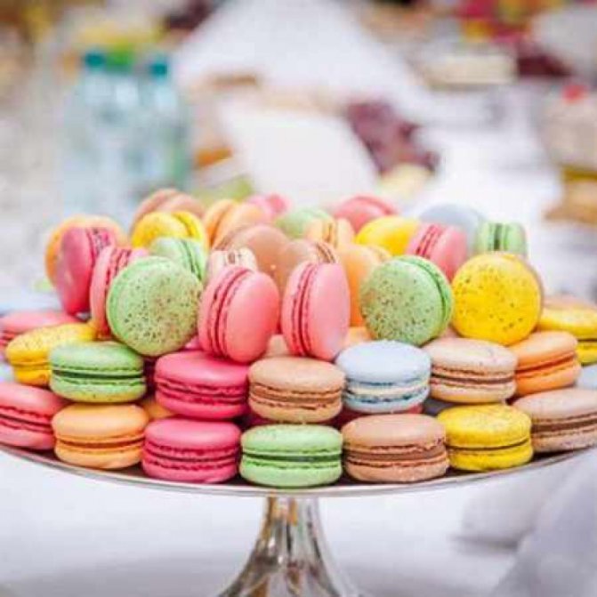 Десерт родом из Франции, который благодаря своему цвету и небольшому размеру широко распространился за ее пределами и попал в ассортимент кэнди-бар ов. Для изготовления этой сладости используется молотый миндаль. Две половинки макарона соединяются начинкой. Макарон окрашивается во всевозможные цвета.
