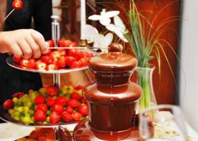 Очень эффектный ход — шоколадный фонтан, который можно взять в аренду. Рядом с ним можно поставить всевозможные фрукты, чтобы гости могли окунать их в шоколад.