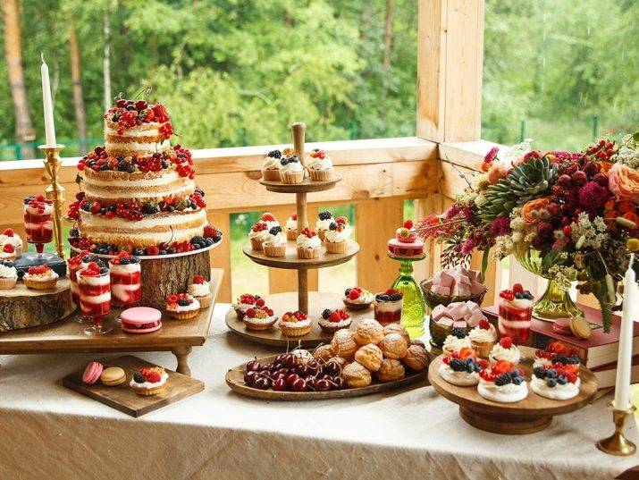 Пирожные раскладываются на плоские тарелки или высокие многоярусные стойки. Для сладостей без обертки, таких как мармелад и пастила, нужно предусмотреть более глубокие конфетницы. Не помешают также лопаточки для набирания мелких видов сладостей, а также мини-пакетики. В них гости смогут насыпать по вкусу рахат-лукум, орешки, желейные конфеты.