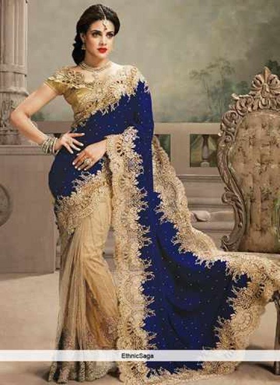 Праздничной считается вышивка стразами, бусинами и камнями. С ними форма сари кардинально меняется. Свадебный наряд становится объемным, умело скрывает недостатки фигуры, подчеркивает преимущества. Удачно посаженные стразы на поясе делают талию утонченной, а бедра – женственными. Невесты с радостью останавливают выбор на сари с объемными украшениями.