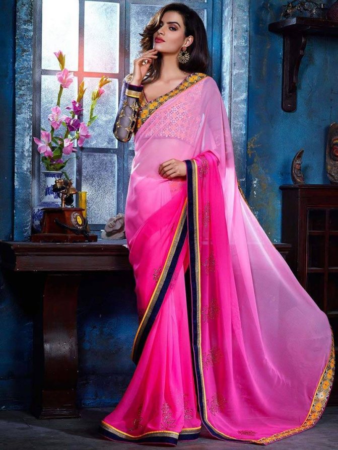 Цвет тропического цветка более знакомый для нас, как цвет фуксии. Праздничный и очень женственный, благоприятный для индианок. Дарит радость, положительные эмоции, хорошее настроение. Ярко-розовые сари во все времена носили королевы и принцессы. Следуя индийским традициям уместно сочетать его с зелёным.