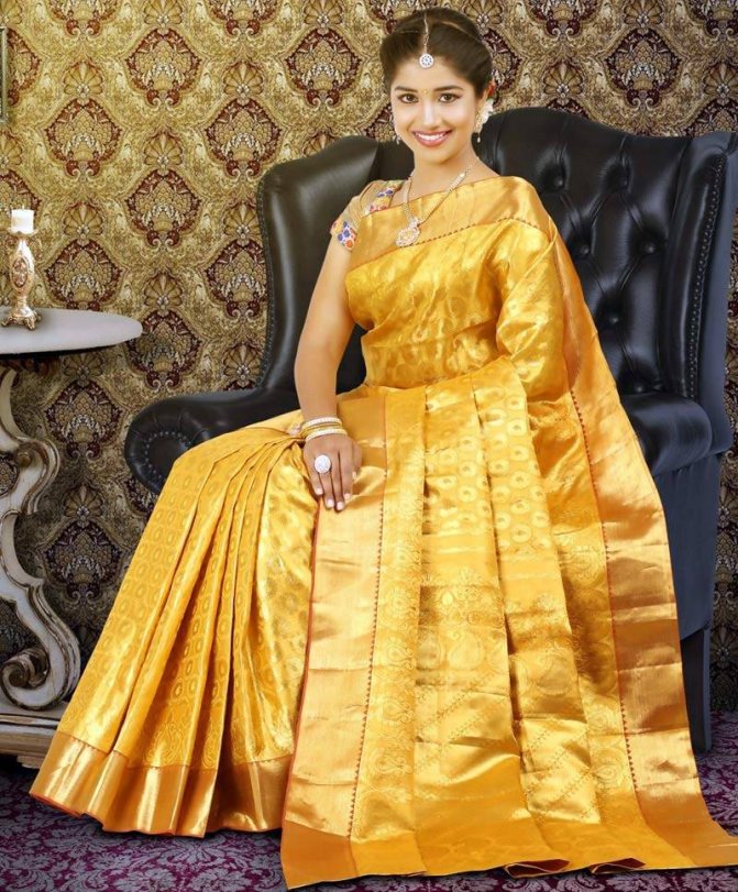 Праздничное сари полно золота. Это вышивки, нити, полоски, клетки, бахрома. Не стоит забывать о дополнении – украшениях. Чаще привилегированные касты надевают на невесту большое количество золота. Среди них цепочки, подвески, серьги, которые передаются по наследству от поколения к поколению. Реже девушке разрешают надеть бижутерию. Этот вариант возможен только в нескольких случаях (экономическое положение семьи, соответствие единого стиля с декором сари).