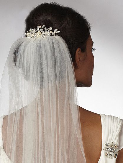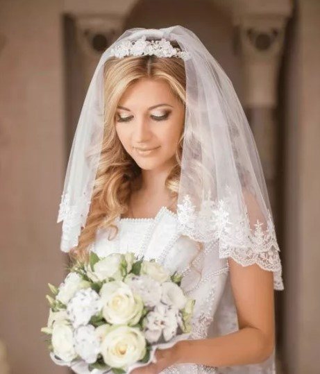 Пожалуй, это самый простой вид, так как его можно вообще не закреплять, а просто накинуть сверху на прическу, закрывая лицо. Либо, если нужно оставить лицо открытым, то фата просто крепится несколькими шпильками по периметру.