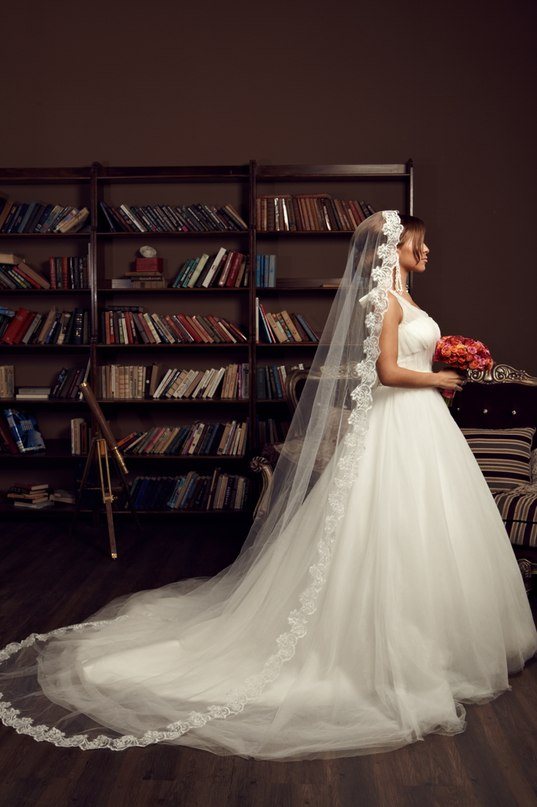 Это довольно длинное изделие, длина которого в большинстве случаев доходит до пят. По всему периметру такой фаты зачастую проходит богатая кружевная отделка, с обратной стороны которой можно без проблем спрятать маленькие прозрачные заколки либо гребешок, которыми этот аксессуар можно прикрепить к волосам.