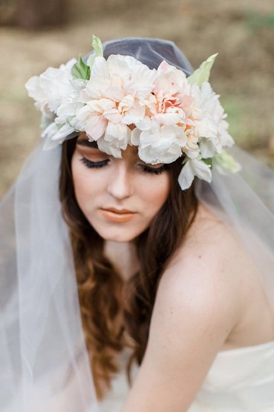 Ещё зафиксировать подобную разновидность свадебной фаты можно, просто надев сверху венок из мелких светлых цветов.