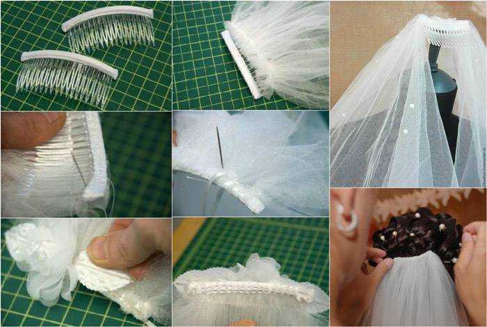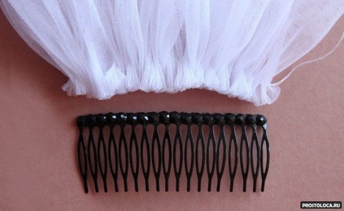 Продеваем атласную ленту через зубья гребешка вплотную к его верхушке и хорошенько закрепляем. К самой атласной ленте уже пришиваем нашу фату. Такой способ уместен, если гребешок декоративный, в случае же, если гребень простой и его видно не будет, фату можно пришить сразу к гребню той же атласной лентой, как на картинке выше.