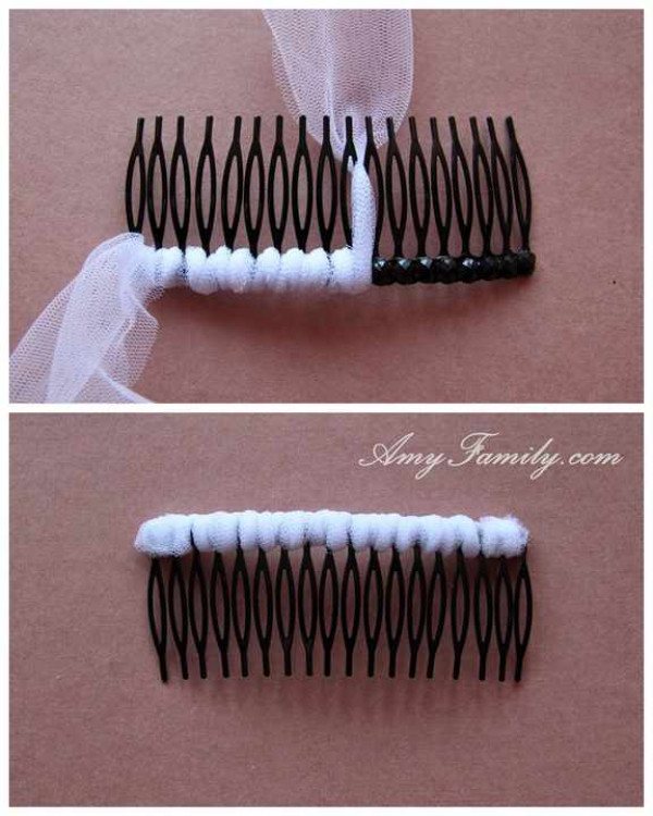– Приложите гребень к месту сборки и пришейте за атласную ленту к фате.