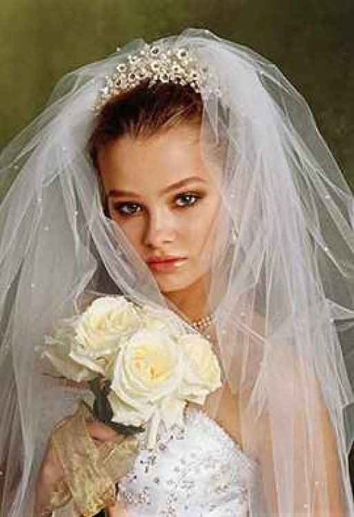 Важно помнить, что для венчания не подойдет фата, закрепляющаяся сзади на макушке. Она должна полностью покрывать голову.