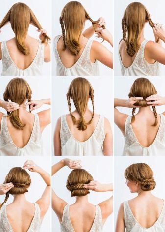 - боковые косы уложить поверх крепления валика и концы скрыть под ним, заколоть все невидимками и зафиксировать лаком;