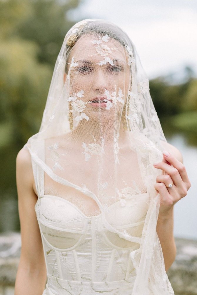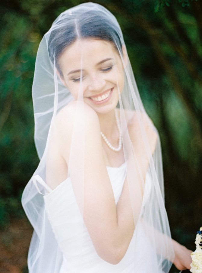 - Фата-sweep длиной до пола полностью открывает лицо и идеально подходит к длинным нарядам без шлейфа;