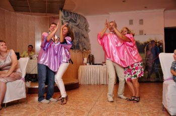 Можно провести не только сценки поздравления новобрачных, но и смешные конкурсы с переодеванием. Главное, чтобы всем гостям было смешно, а у участников не вызвало обиду.