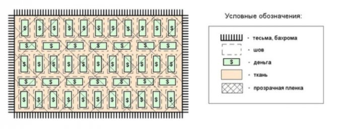 Туда аккуратно уложить купюры в один слой, так, чтобы они покрывали всю поверхность и находились между двумя листами чехла. Далее придется выполнить кропотливую работу: простегать прямыми швами линии между бумажками.