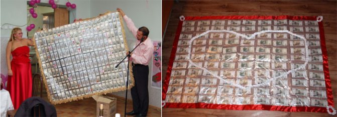Ковер на свадьбу из денег – оригинальная и забавная идея. В хозяйстве он будет бесполезным, но такой подарок доставит массу удовольствия молодой паре. Купюры раскладываются рядами, хаотично, каким-либо узором. Лучше использовать купюры разного номинала, чтобы узор выглядел разнообразным. Чтобы сделать ковер из денег, разложите купюры на ткани, накройте пленкой. Каждую денежку обшейте вручную либо на машинке.