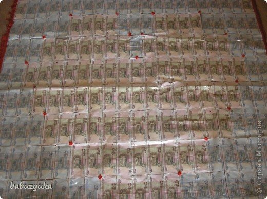 Купила плотную парниковую пленку, сложила пополам и к сгибу вкладывала между слоями купюру. Прошивала пленку с одного края купюры, потом вкладывала впритык к этой следующую и опять прошивала с одного края. И так 21 ряд по 10 купюр в каждом. Т.е. получилось, что прошиты были только горизонтальные ряды, а чтобы купюры сидели крепко, потом я прошила и вертикальные ряды. Деньги не прошиты! Прошивалась только пленка. Сначала хотела все это сделать на машинке, но ей пленка не понравилась