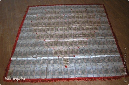 Либо если будут упакованы финансы одного приглашенного, то лучше разменять их на пятидесятки и сотни – банкнот будет много, и покров можно будет изготовить большого размера.