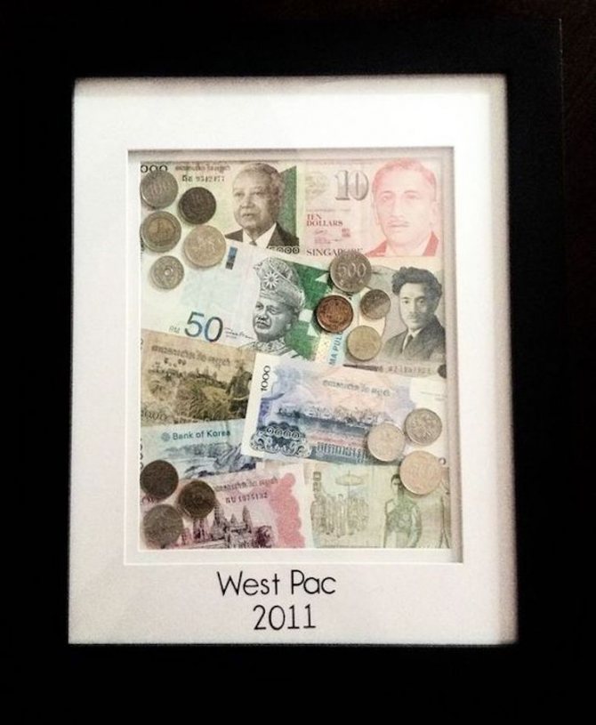 Многие любят составить коллаж в рамке из денег. Для этого потребуется обычная фоторамка, в которую аккуратно вклеиваются деньги. Купюры можно дополнить пожеланиями или смешными надписями. Можно добавить в рамку фотографии или картины из денег – фантазия не ограничена.