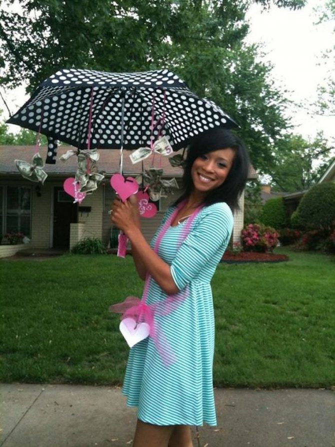 Зонт с деньгами – тоже необычный вариант. К раскрытому зонтику крепятся купюры на леску, затем он аккуратно закрывается и дарится именно в закрытом виде. На празднике же предлагается раскрыть зонт «для примерки». Когда он открывается, создается эффект денежного дождя.