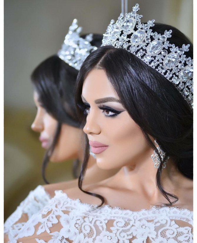 Каждая девушка чувствует себя настоящей принцессой в свой свадебный день. Если вы думаете, что традиционная тиара слишком банальна, выберите декорированную камнями повязку, которая будет напоминать корону, но в то же время выглядеть стильно и современно. В этом примере аксессуар находится в центре всего образа, поэтому чтобы не отвлекать от него внимание, закрутите волосы в мягкий пучок и оставьте кончики слегка растрепанными.