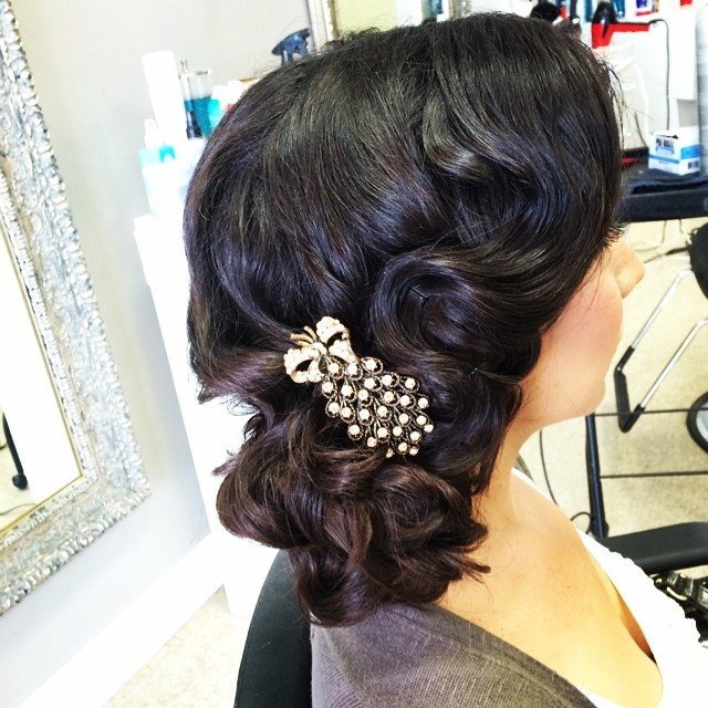 Многие свадебные причёски наших бабушек снова на пике популярности. Эта причёска в стиле 20-х годов прошлого столетия ни капли не утратила своей актуальности. Крупные локоны выглядят очень структурно и закреплены сбоку винтажной заколкой. Чтобы усилить ретро эффект, чёлку необходимо уложить «холодной волной» с помощью геля с эффектом влажных волос. Именно благодаря асимметричному расположению, причёска выглядит ультрамодно и прекрасно соответствует моменту.
