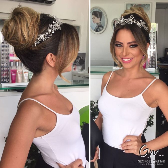 Локоны, сформированные жгутиками и заколотые шпильками с обручем или лентой вокруг головы. А так же греческий стиль – это волосы, закрывающие уши, убранные в пучок. Дополнят образ диадема, цветы, и другие украшения.