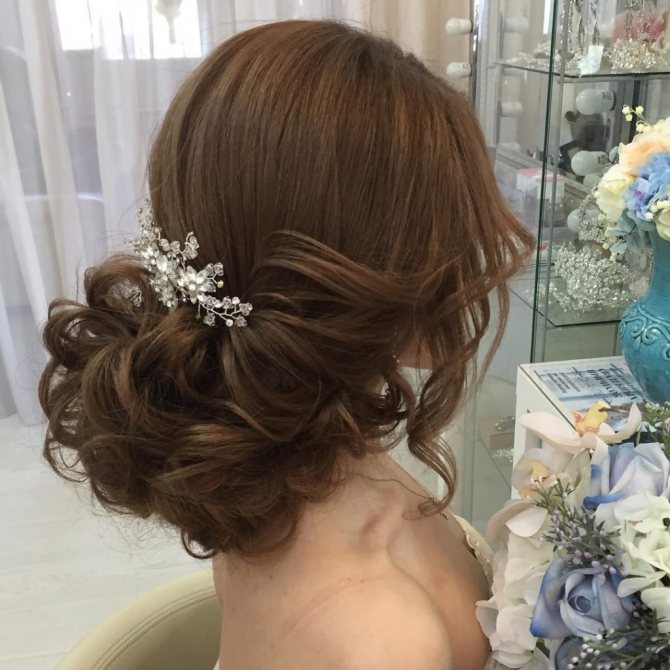 Это современный взгляд на традиционную свадебную укладку. Такой низкий пучок выполняется из волнистых волос, поэтому выглядит пышным и объёмным. В отличие от гладко закрученных пучков, в этом варианте парикмахер не затягивает туго петлю волос, а закрепляет в слегка расслабленном виде, что даёт возможность детально рассмотреть завитки. Изысканное украшение вносит в образ праздничную нотку.