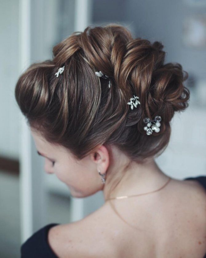 - Каждая прядь из конского хвоста начесывается, выворачивается и прикалывается невидимками