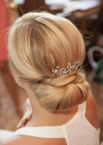 На завитых волосах пучок получится куда более пышным и густым. Допускается выпустить несколько отдельных прядей по бокам причёски, или же оставить всю красоту на затылке, украсив гребнем, диадемой или цветами.