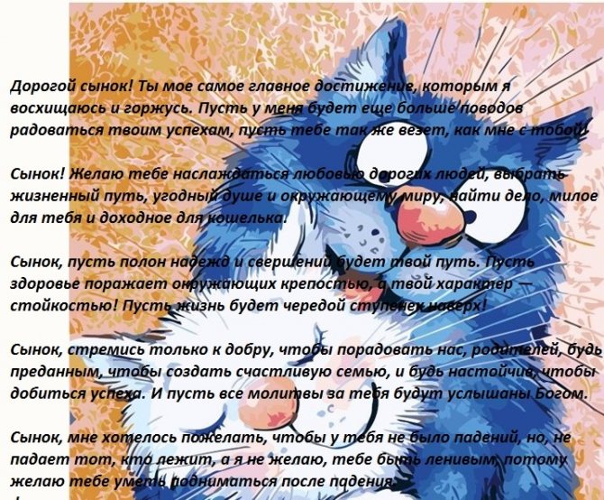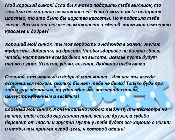 Бог не мог быть все время со мной и помогать только мне — поэтому он подарил мне сына! Ты единственный мужчина, ради которого я пойду на любые лишения и на коленях буду умолять вернуться, если ты собьешься с пути! Я не задумываясь отдам за тебя жизнь! И пусть в тебе будет даже два метра роста, ты для меня навсегда останешься ребенком, нуждающемся в моей любви! Желаю тебе не знать в своей жизни горя и потерь. Всегда улыбайся, потому что настоящие мужчины не плачут ни при каких обстоятельствах! Сынуля! Я целый день в заботах и делах — готовлю кашки, глажу твои вещи, убираю за тобой игрушки! Сядешь передохнуть и думаешь: и как бы я жила одна? Совсем бы лентяйкой стала! Ты мой любимый озорник и заводила с хитрой искоркой в глазах! Желаю быть тебе всегда лидером и вести за собой друзей на ваши славные мальчишеские подвиги! И после великих сражений, из которых ты всегда будешь выходить только победителем, я буду лечить твои коленки зеленкой! Дорогой сын! Живи так, чтобы родители тобой гордились. Женщины любили без оглядки и шли за тобой хоть на край света. Завистники лопнули от своей зависти, а друзья и знакомые брали тебя в пример для подражания. Никого не заставляй страдать и не бросай в неразрешимых ситуациях, потому что все возвращается! Я, как твой отец, надеюсь, что ты будешь честным и благоразумным!