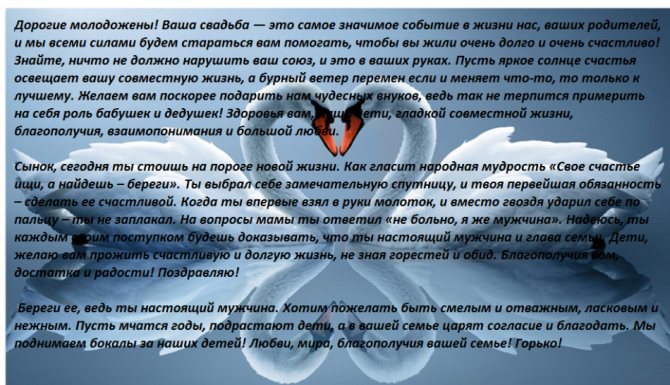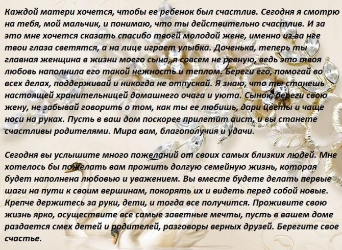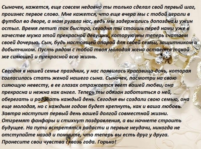 Я тебя, сынок, Со свадьбой поздравляю! Новую семью на жизнь благословляю. В мире и согласии вам желаю жить, Уважать друг друга и любовь хранить. Чтобы шли по жизни вы к плечу плечо, Свою половинку любили горячо. Пусть над вашим домом аисты кружат, Вам приносят деток, ну а нам внучат.