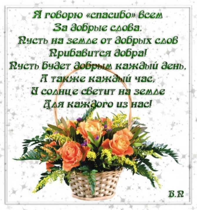 Я в этот день прекрасный Весь мир тебе дарю, «Здоров будь, весел, счастлив», — От сердца говорю. Пусть жизнь твоя течет рекой, Минуя камни и пороги. И пусть обходят стороной Тебя печали и тревоги.