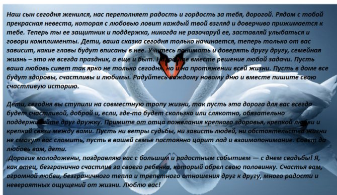 Как отец я очень горд, Что род продолжается, Разрастается семья, Дочкой/сыном пополняется. Пусть растет и дальше род, Ширится и множится, Внук за внуком пусть идет, Род продолжится. Молодым желаю я, Счастья, радости, любви, Крепкой пусть будет семья И Господь благословит!