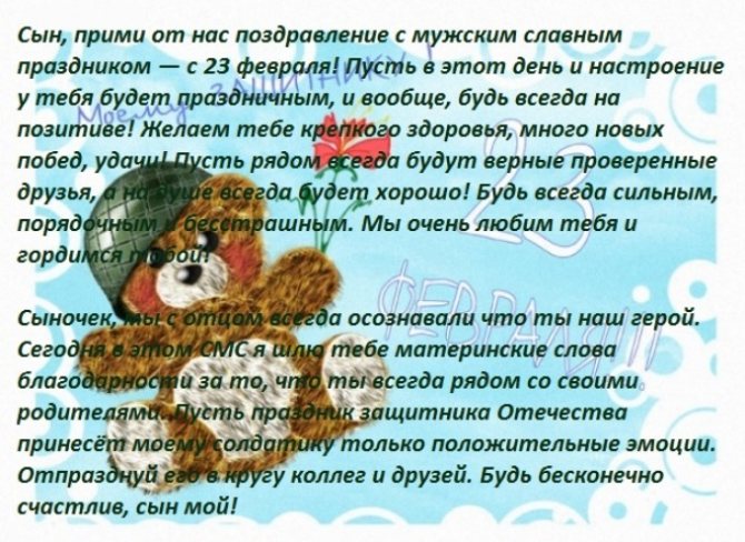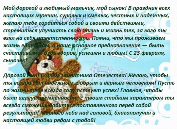 Сын, сегодня твой праздник, а значит, я должен поздравить тебя, ведь я твой отец и хочу тебе только лучшего. Ты уже совсем взрослый, ты все прекрасно понимаешь, а значит, должен ставить перед собой цели и приоритеты. Каждый мужчина должен быть сильным и ответственным. В первую очередь, это нужно, чтобы суметь защитить свою семью и тех, кто слабее, а уже потом для защиты государства, если это вдруг однажды потребуется. Ты должен понимать, что с возрастом на мужчину возлагается все больше обязательств и ответственности, поэтому ты должен быть к этому готов. Я поздравляю тебя с днем сына и желаю не бояться трудностей и всегда идти к намеченной цели. Всегда подумай, прежде чем сделать. Помни что нужно беречь своих родных и близких. Мы любим тебя и гордимся тобой. Мы верим, что в твоей жизни все сложится так, как ты задумаешь.