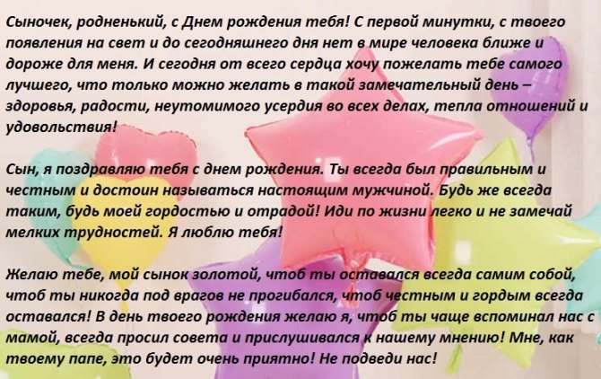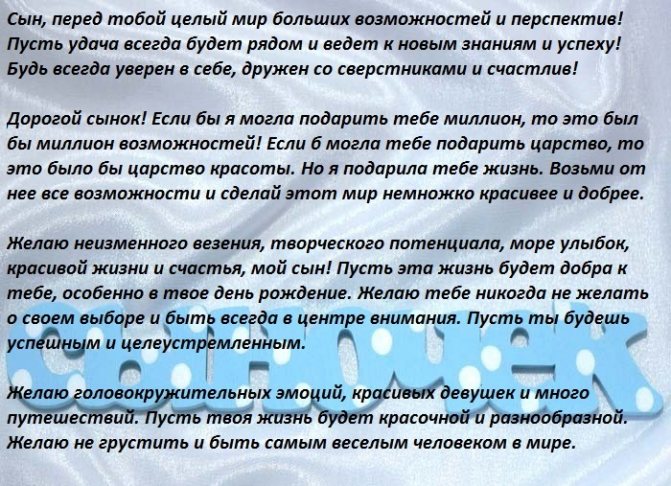 - Сыночек, поздравляю тебя с этим праздничным днем. Будь счастлив, удачлив и всегда здоров. Пускай твои глаза всегда искрятся от неуемной энергии, пускай все в этой жизни тебе будет по плечу. Шагай по жизни высоко подняв голову, смело иди к своей мечте. И пускай, где бы ты не находился, тебе встречаются только добрые, открытые и отзывчивые люди. Родной мой, помни, ты главный человек в моей жизни, и ты можешь положиться на меня в любой ситуации.
