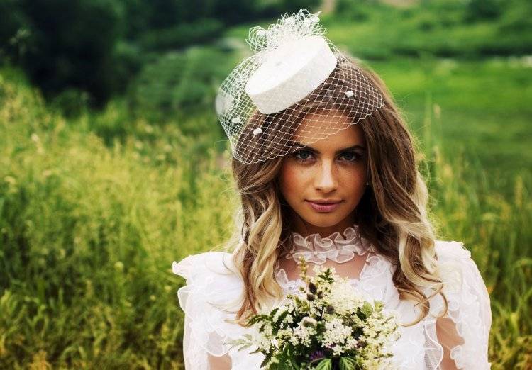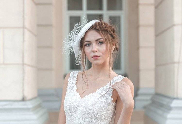 Подчеркнёт женственность героини торжественной церемонии и подойдёт для венчания в церкви маленькая шапочка для невесты, по форме напоминающая шляпку-таблетку, где вуаль покрывает всё лицо. Здесь, как правило, другие украшения отсутствуют, и акцент делается именно на сеточку, длина которой может доходить до подбородка.