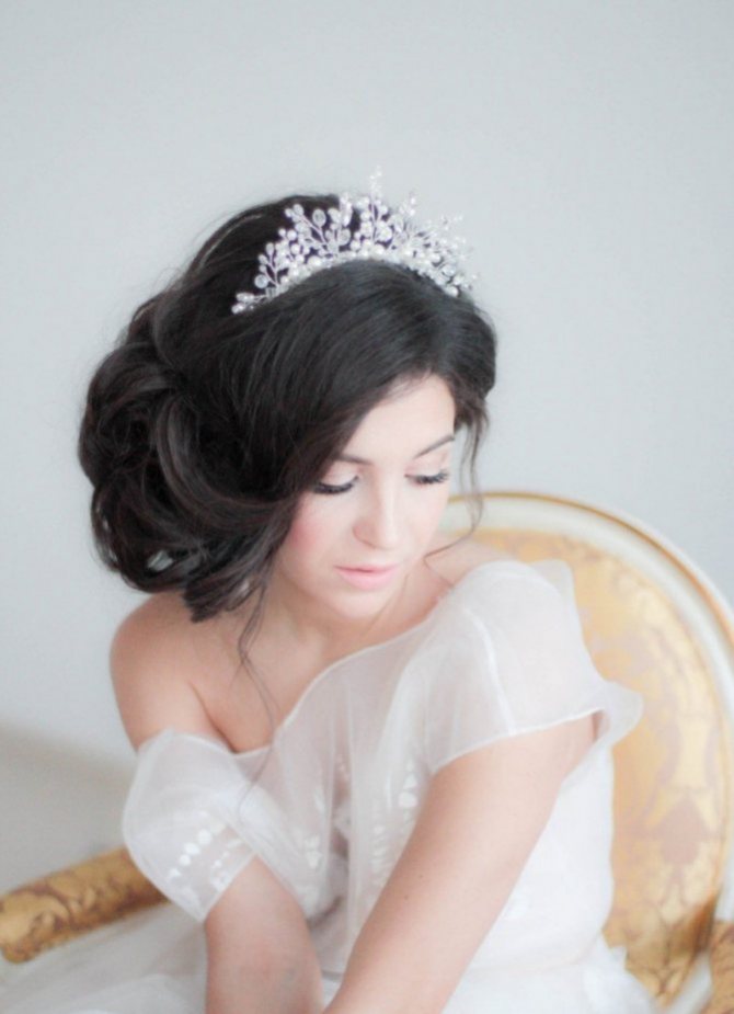 К таким прическам подойдут диадемы-тиары с креплением, как у ободка.