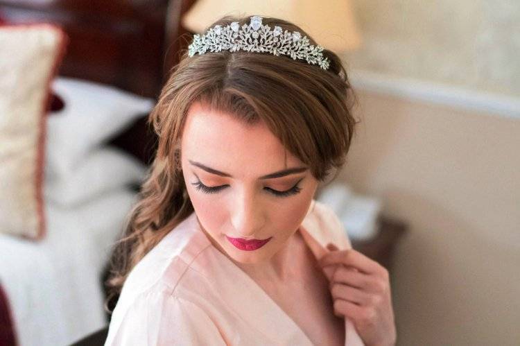 Небольшой аксессуар а-ля корона будет хорошо смотреться с длинными распущенными волосами или в контексте гладкой прически для длинных волос. Локоны должны быть крупными, красиво уложенными, по типу голливудских, ниспадающими на плечи или приподнятыми. Многочисленные кудряшки, идущие по периметру всей головы – неприемлемо.