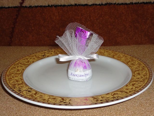 Из ткани нужно вырезать круги. Для этого вырезаем квадраты примерно 15 на 15 см, складываем их вчетверо и по дуге срезаем край. Конфетку ставим в середину такого круга, оборачиваем записку с именем вокруг ее основания. Аккуратно заворачиваем конфету в сетку и завязываем сверху бантик из ленты. На одну конфету уходит примерно 20 см ленты, но сразу нарезать ее кусочками не стоит: завязывать короткие концы менее удобно. Края ленты аккуратно обжигаем свечкой или зажигалкой, чтобы они не начали осыпаться.