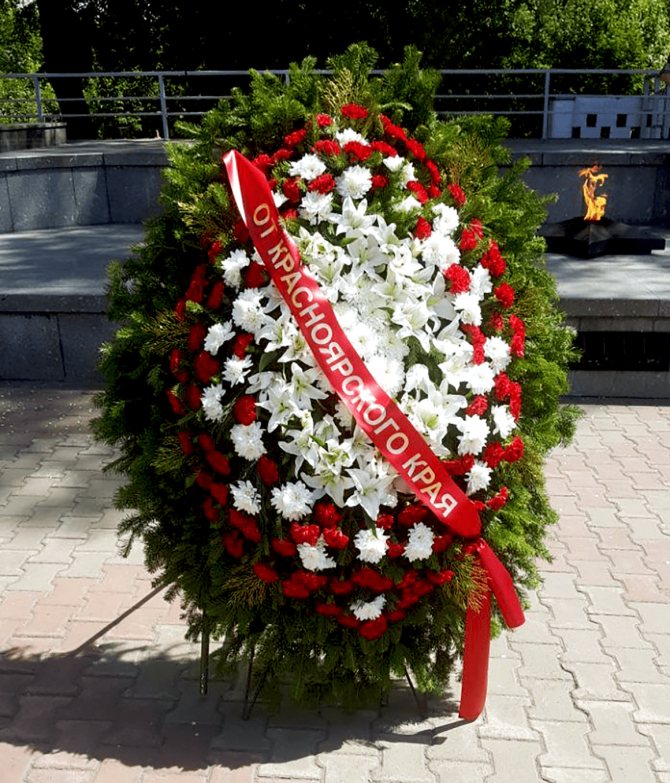 Чистый красный цвет в мемориальном венке помогает подчеркнуть торжественность события