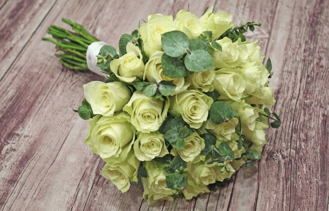 Зеленый цвет иногда ассоциируется с долларами. Можно подарить букет в холодных зеленых оттенках мужчине, подчеркнув его статус.