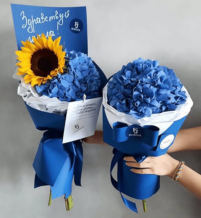 Синий букет гармонично дополнит образ мальчика в школьной форме, который пришел на линейку 1 сентября. Источник: flowersjuli_